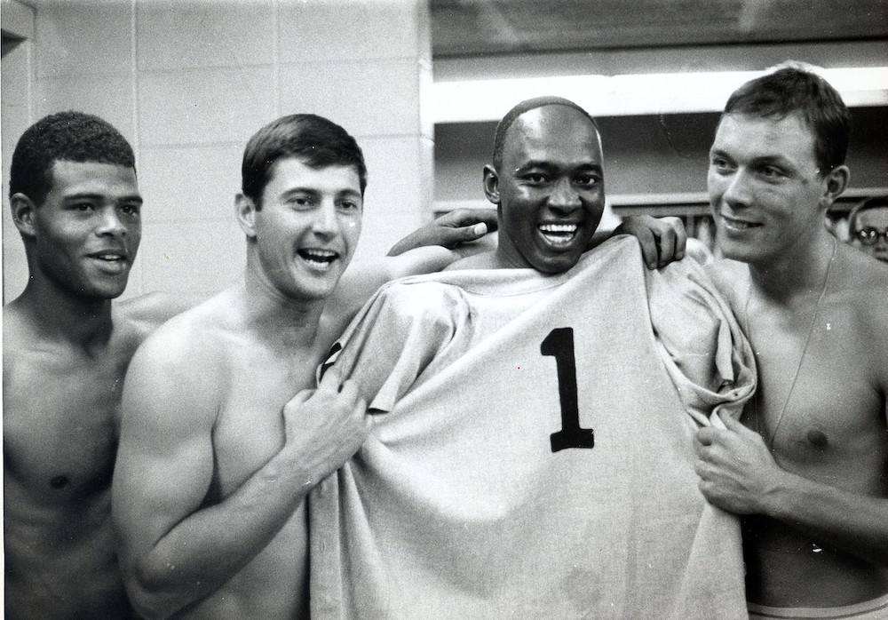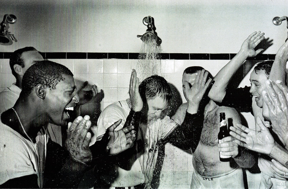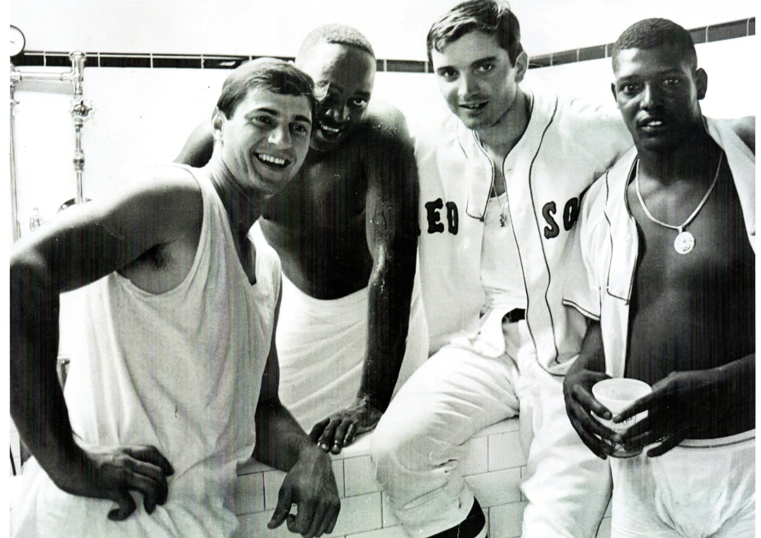 In a scrapbook I started at age 11, there’s a faded news clipping from the Worcester Telegram that features a photograph I feel best captures the essence of the Impossible Dream Red Sox. It immediately encompasses the full spectrum of what endears them to Red Sox fans to this day. It shows Reggie Smith, Carl Yastrzemski, George Scott, and Mike Ryan stripped to the waist in the visitors’ clubhouse at Comiskey Park holding up teammate Joe Foy’s number one jersey to proclaim the Red Sox perch atop the American League.